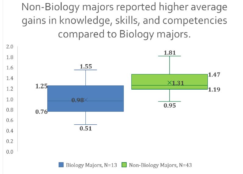 This graph (from our external evaluator, dr. Steuck’s report) shows the impact the field trip had on our non majors. The gain is much higher for them compared to the majors. This is not completely unexpected- students in the biology major are probably more invested/committed already to science than non majors. But it was still cool to see. If one half day field trip and an extra week of discussions around it could make this change, what could be done with more regular activities and a curriculum incorporating research from the early Gen Ed courses?